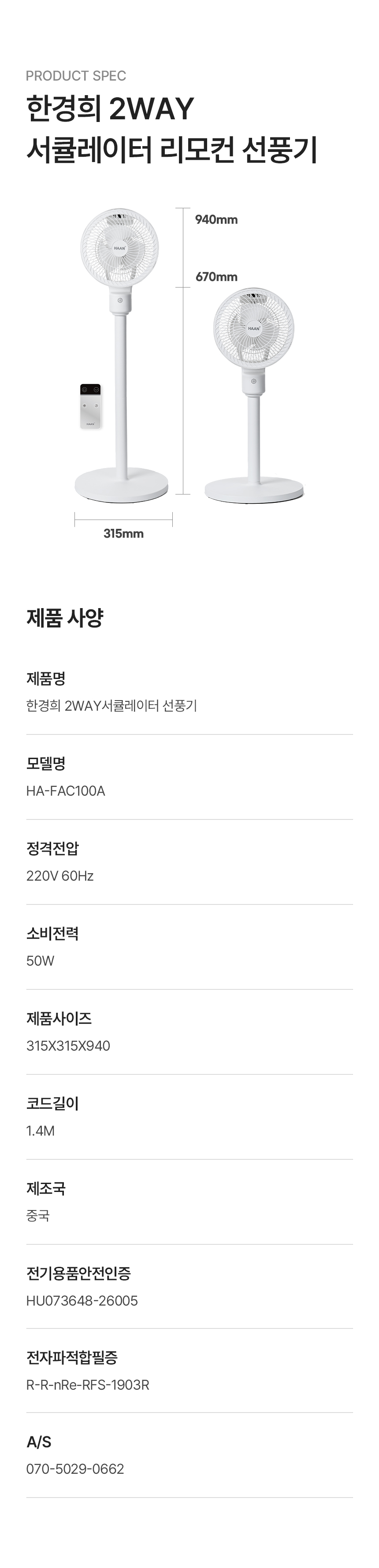 한경희 2WAY 리모컨형 서큘레이터 선풍기 HA-FAC100A